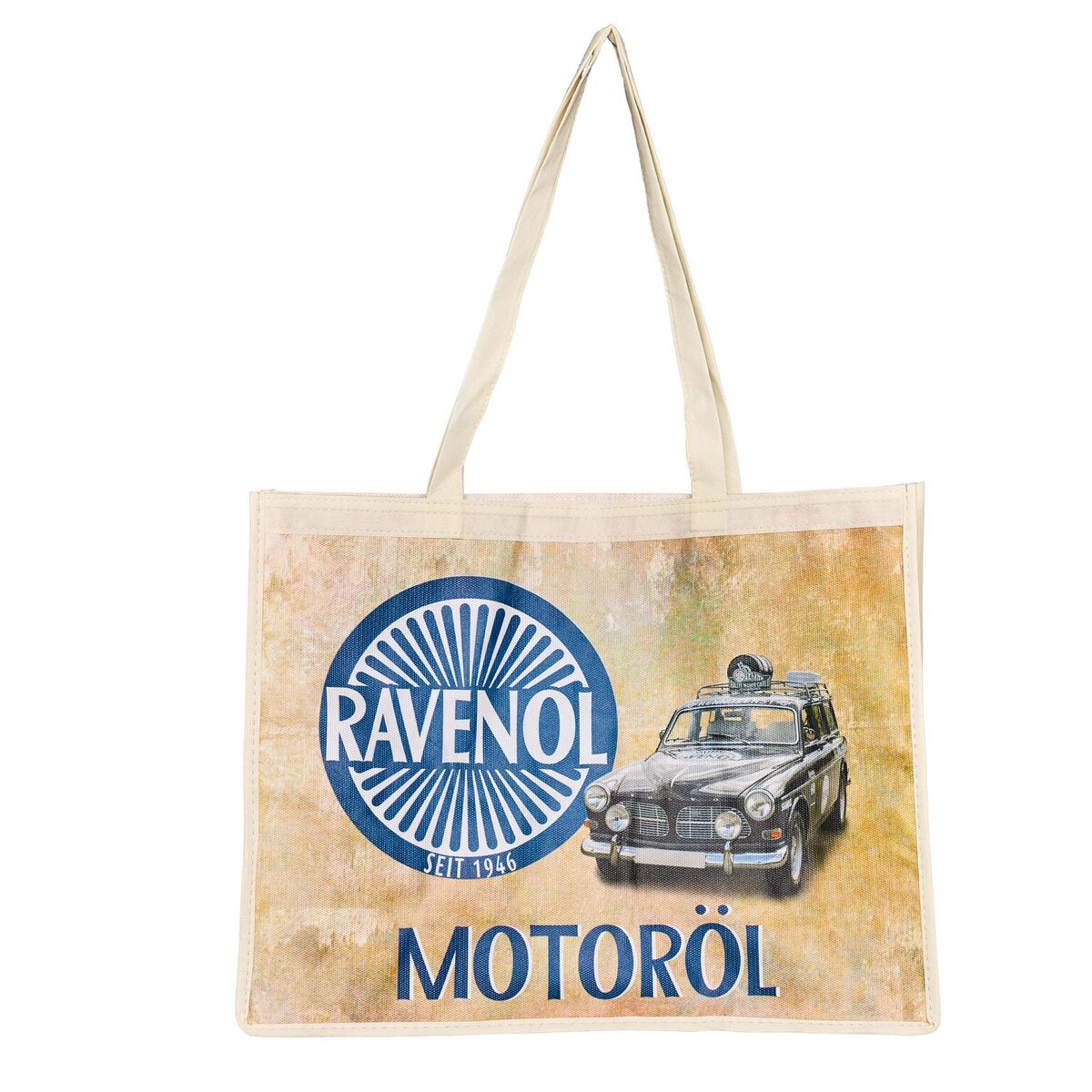 Die RAVENOL Tragetasche mit Laminierung überzeugt mit ihrem attraktiven Design, das eindrucksvolle Motive von RAVENOL Oldtimer und Classic-Ölen zeigt. Sie ist ein praktischer Alltagsbegleiter und zugleich eine elegante Möglichkeit, ihre Verbundenheit mit der Marke RAVENOL auszudrücken.
